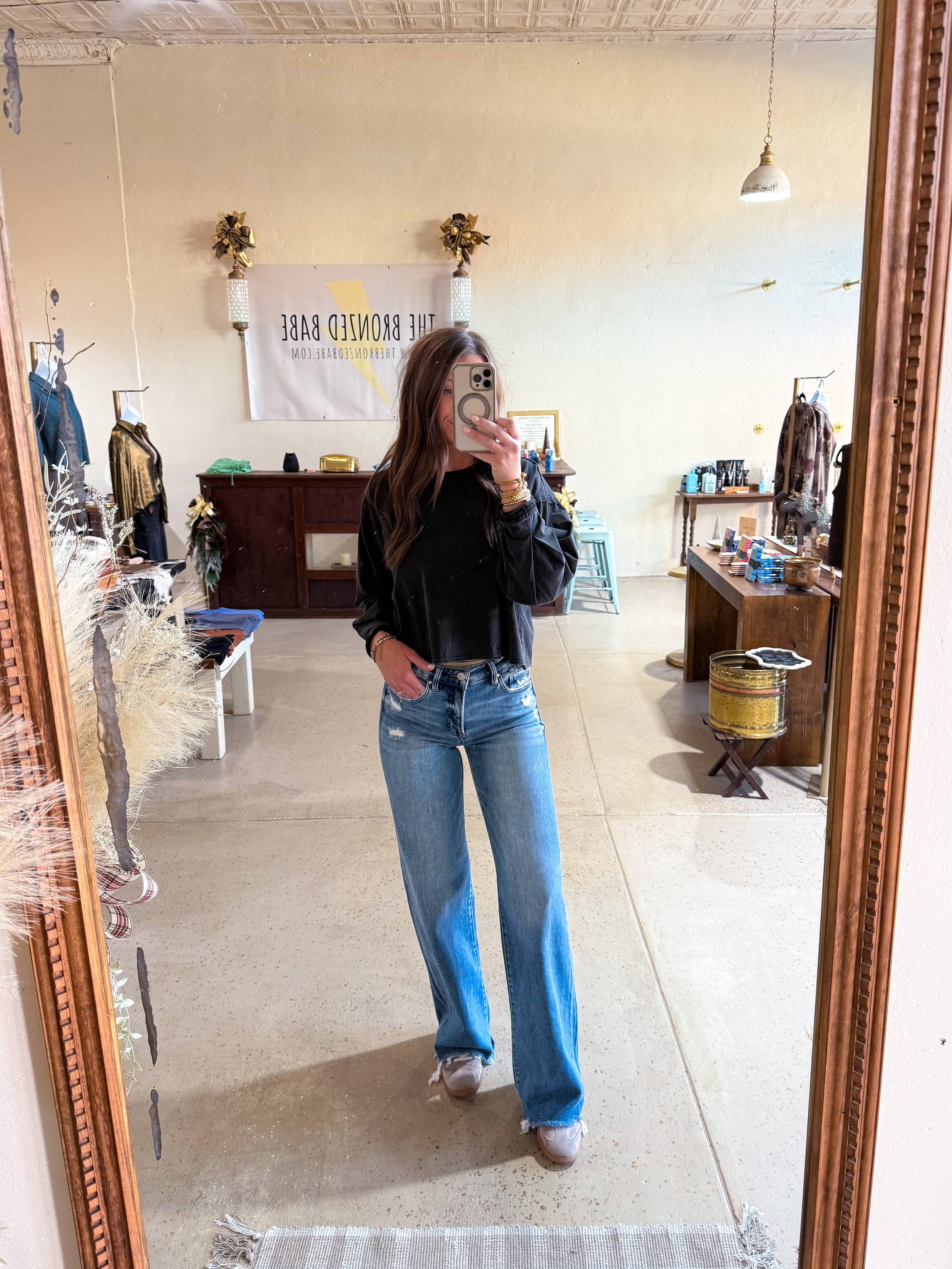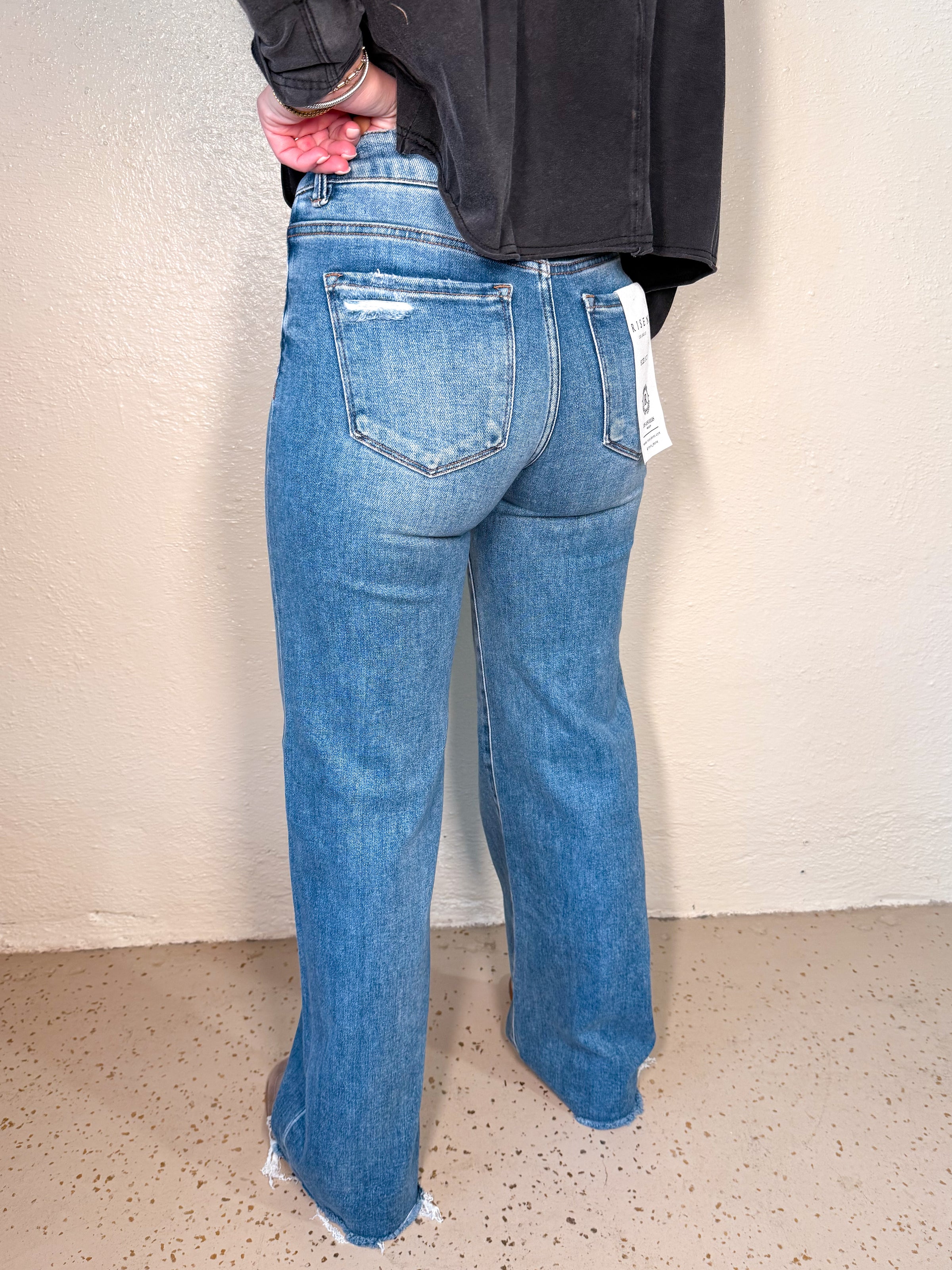 RISEN - Mid rise wide leg raw hem jeans.