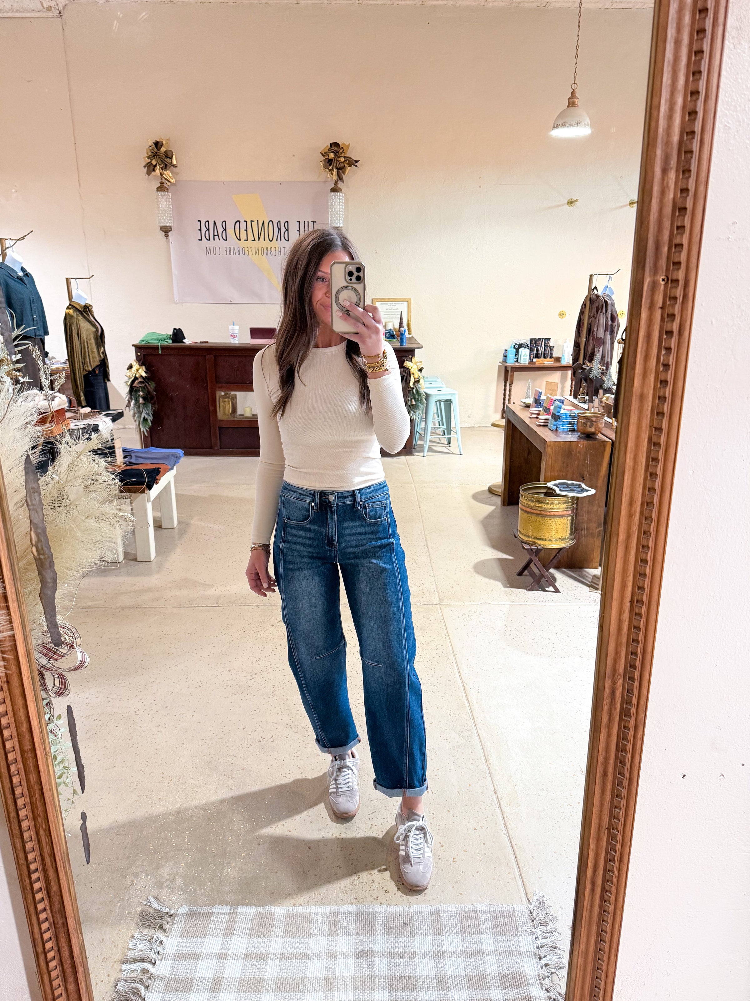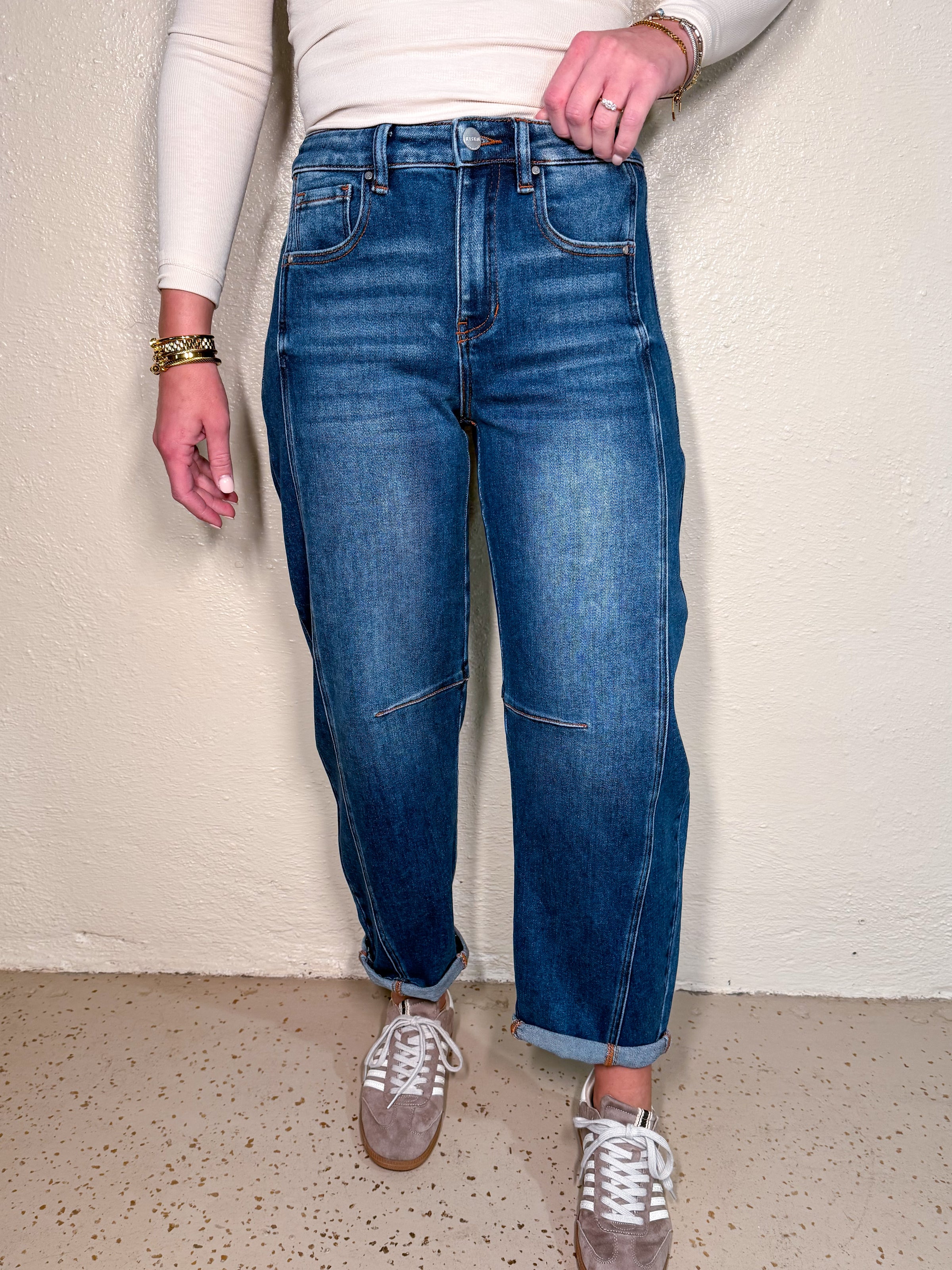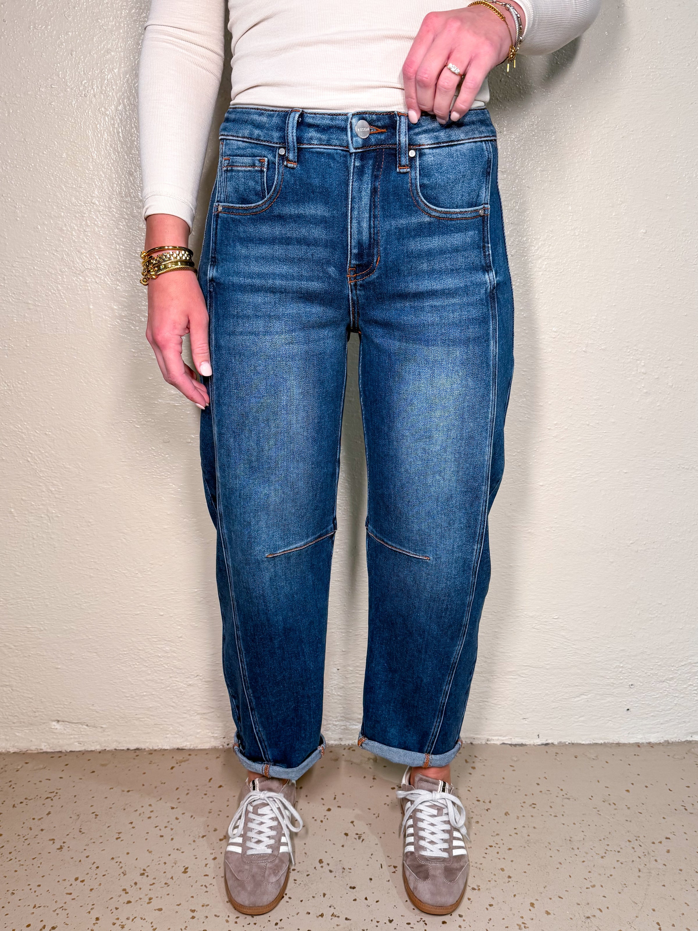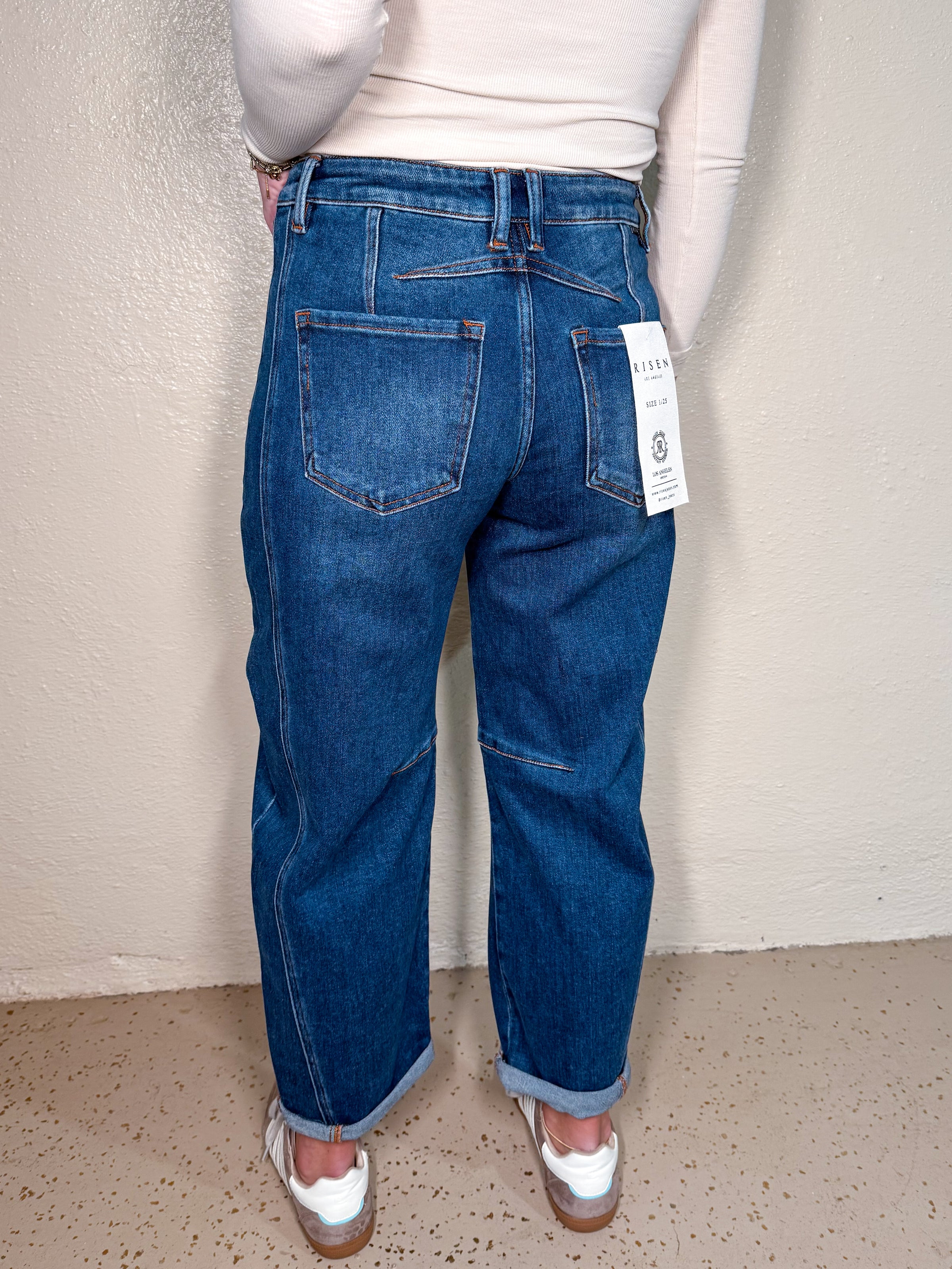 RISEN - High rise crop length barrel jeans.