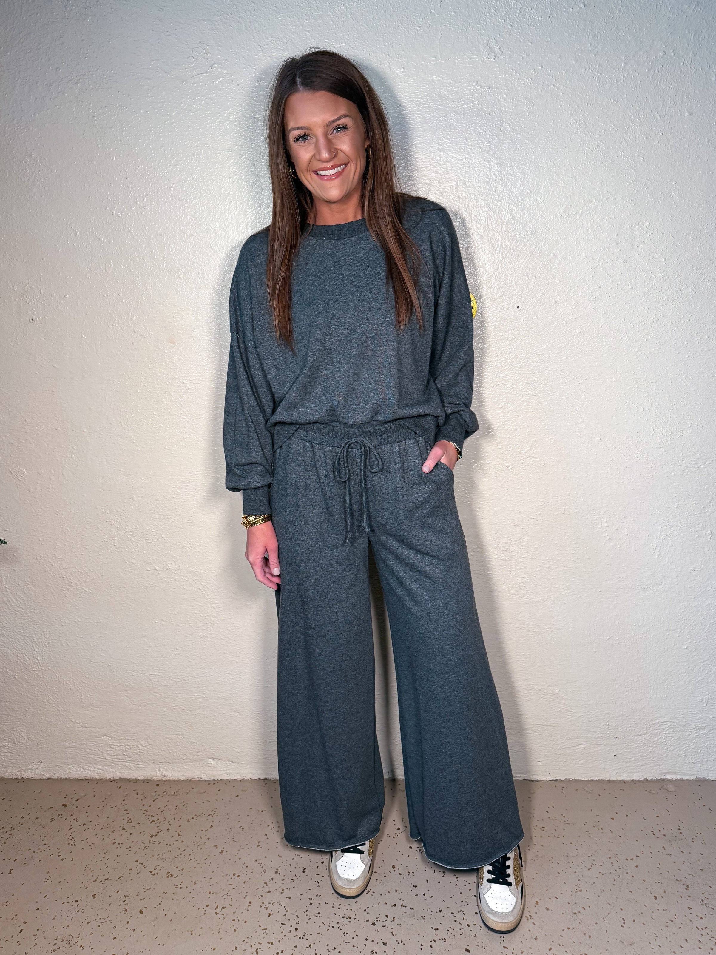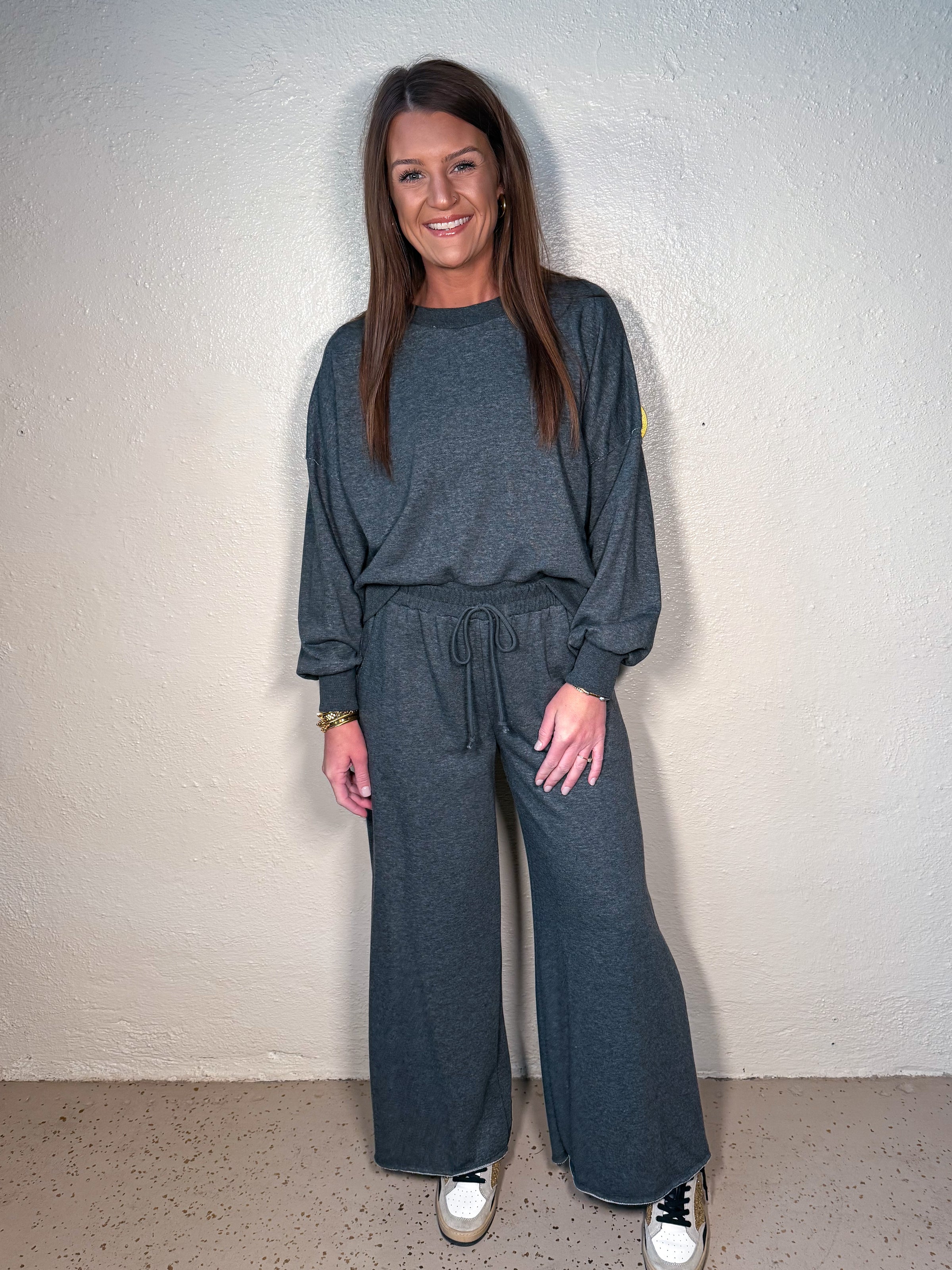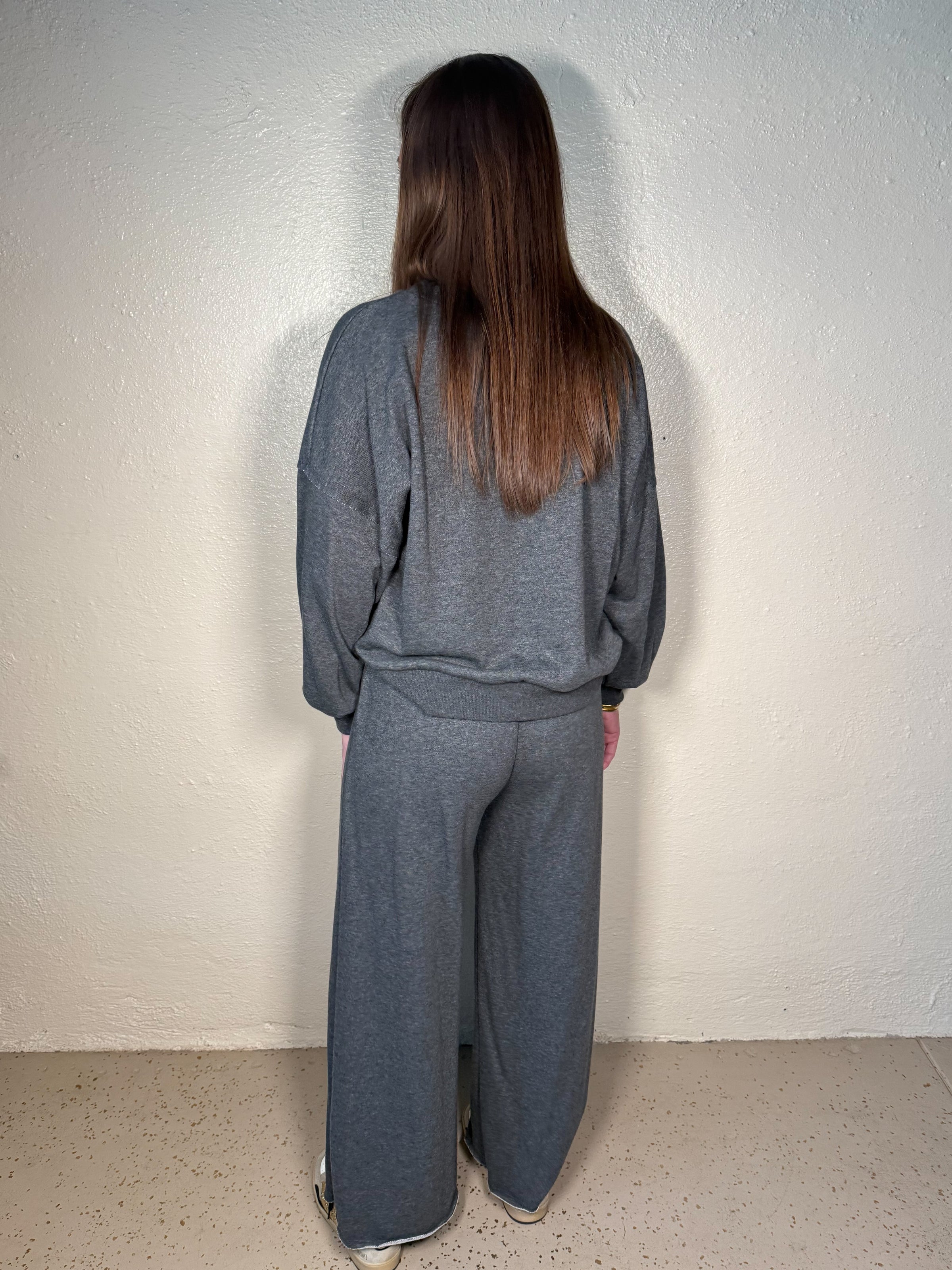 Cotton terry raw hem sweatshirt + pants with elastic waist.