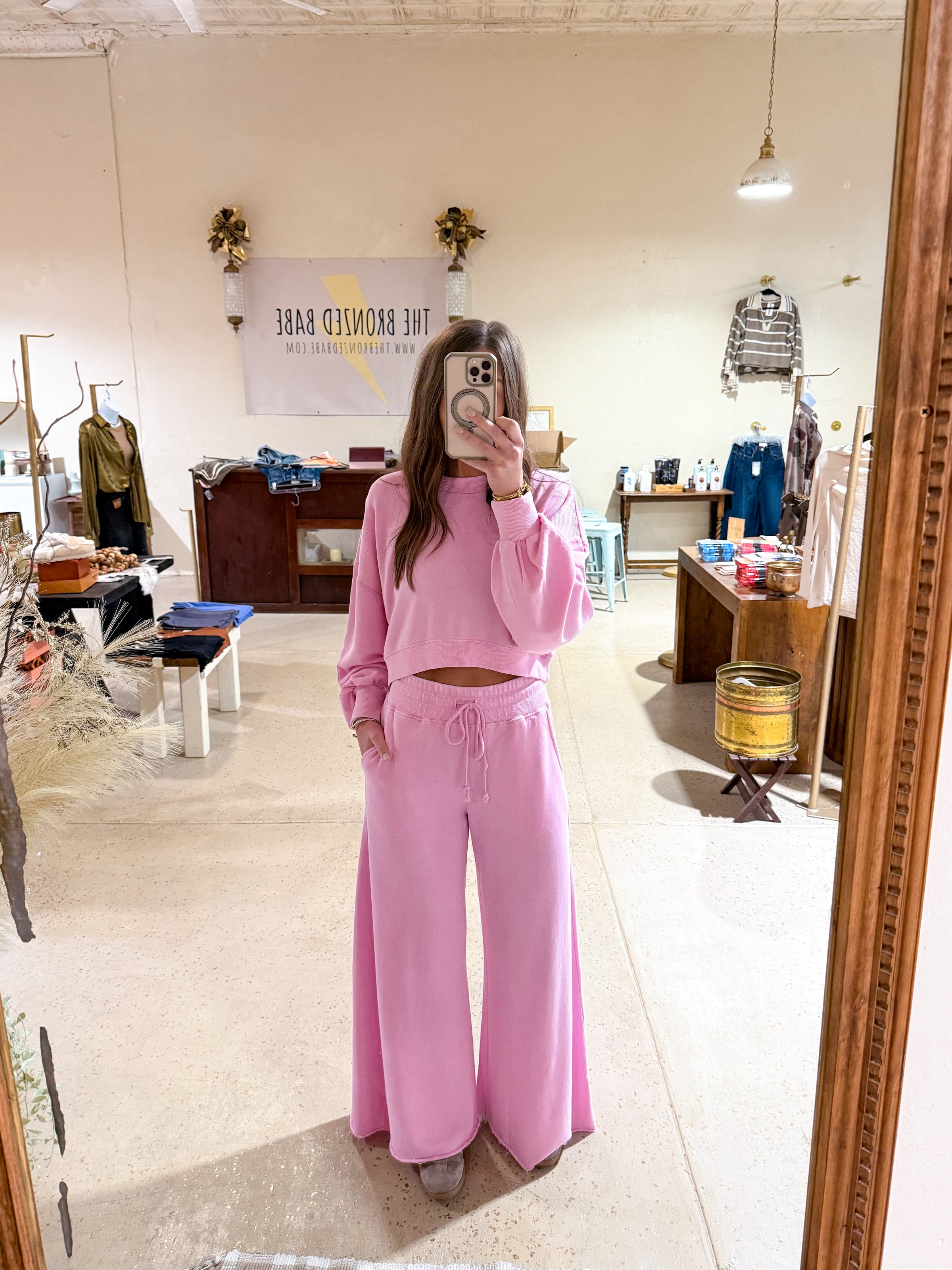 Semi cropped sweatshirt + wide leg sweatpant set.