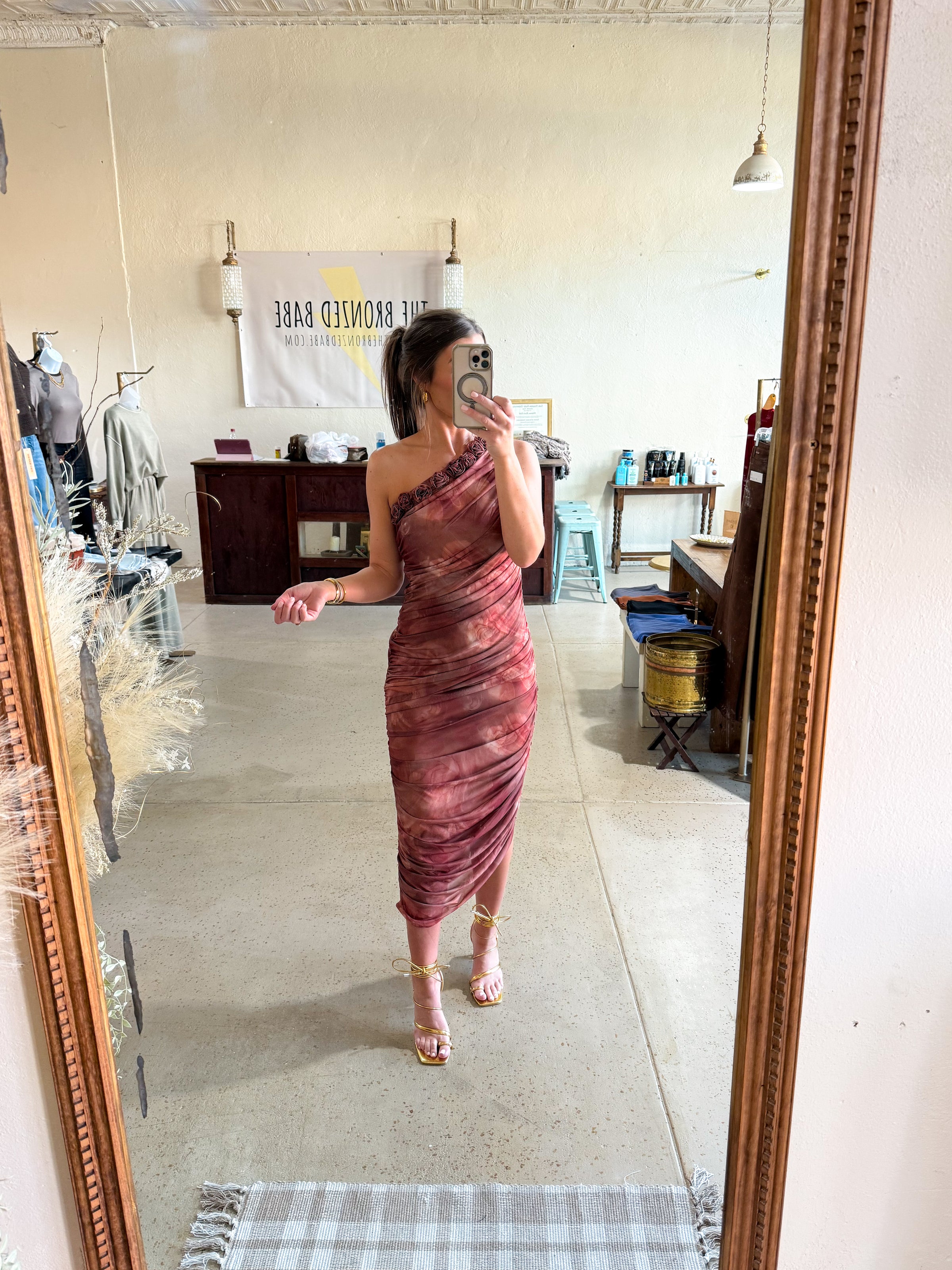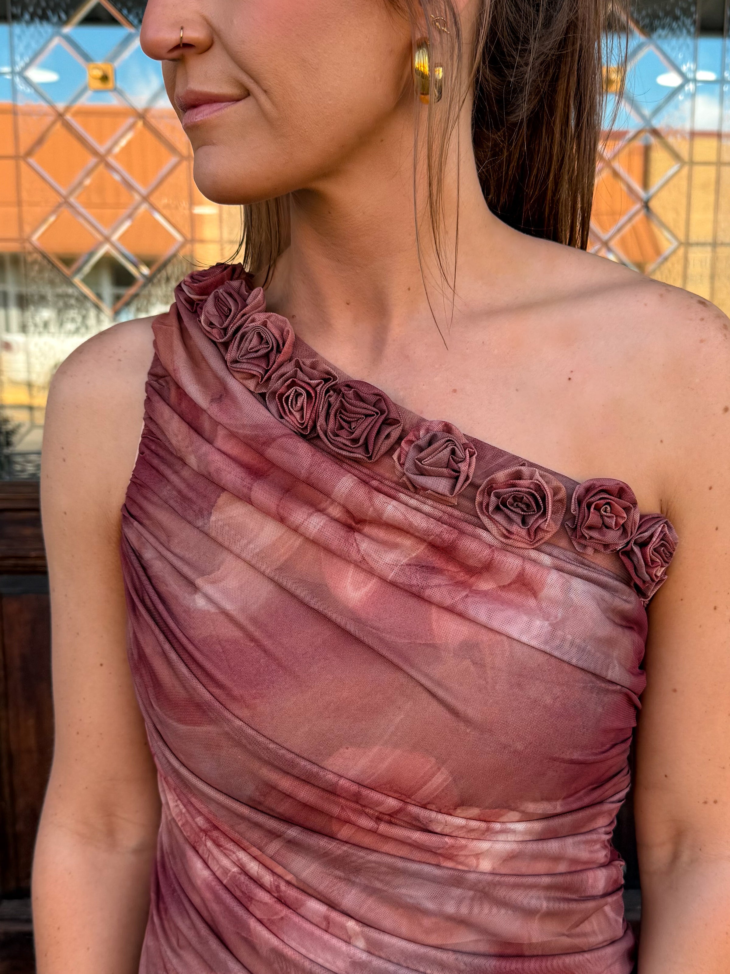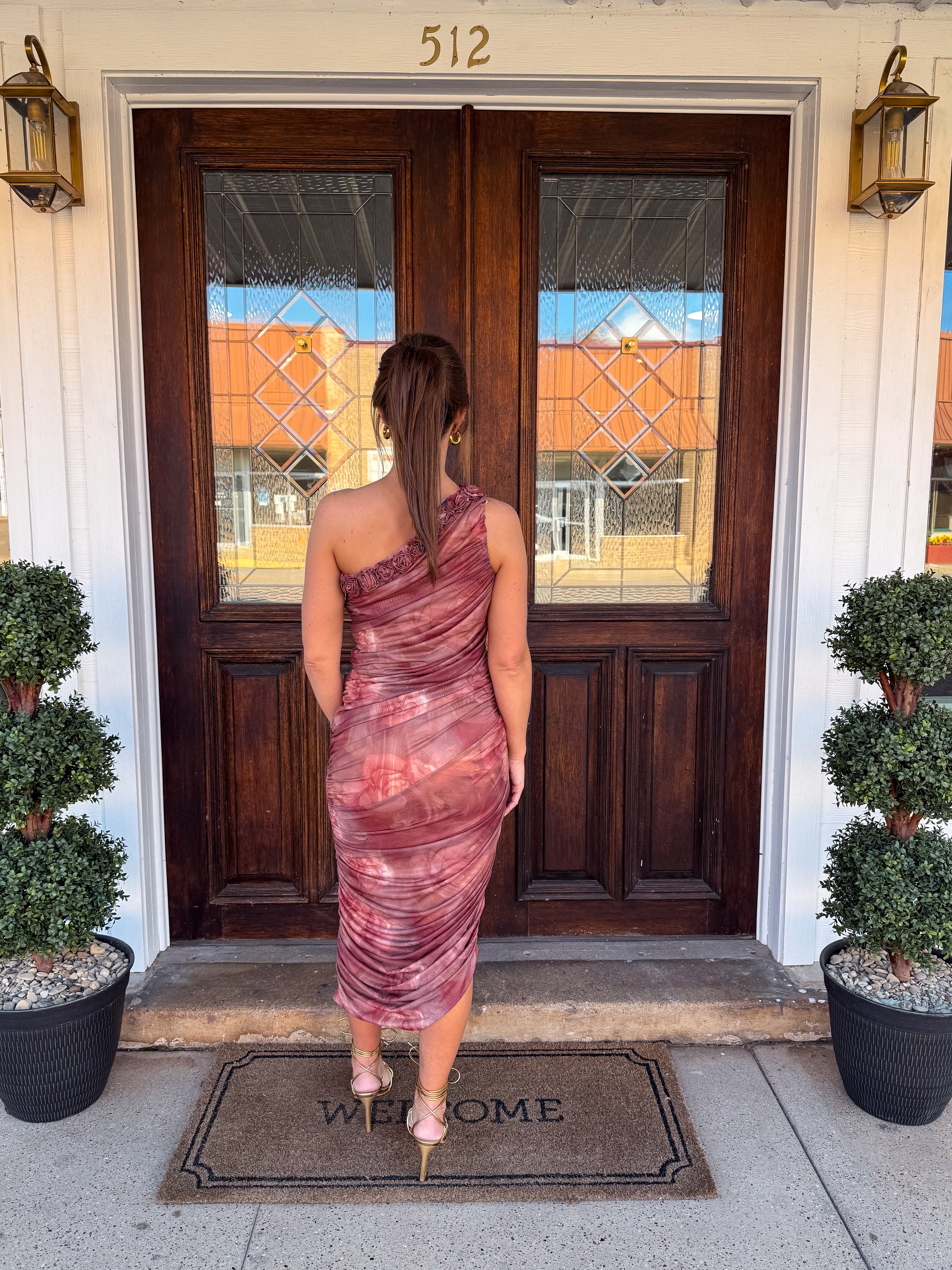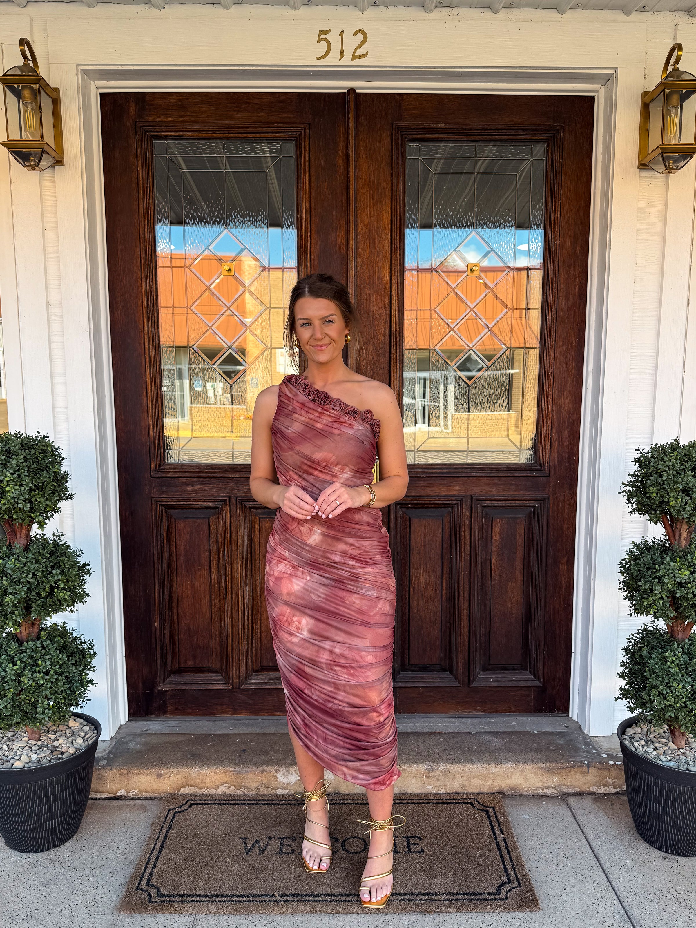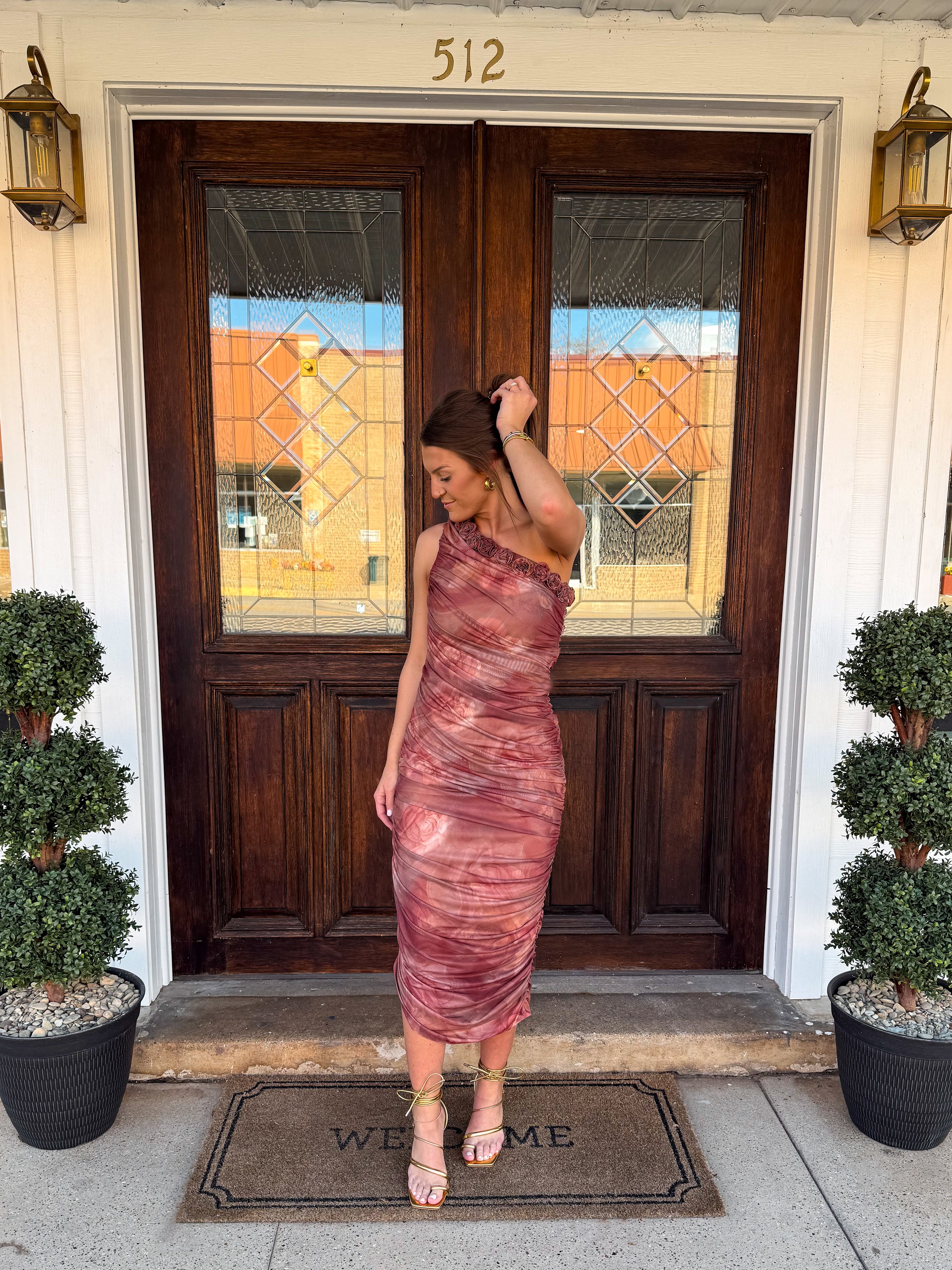 One shoulder ruched midi dress.
