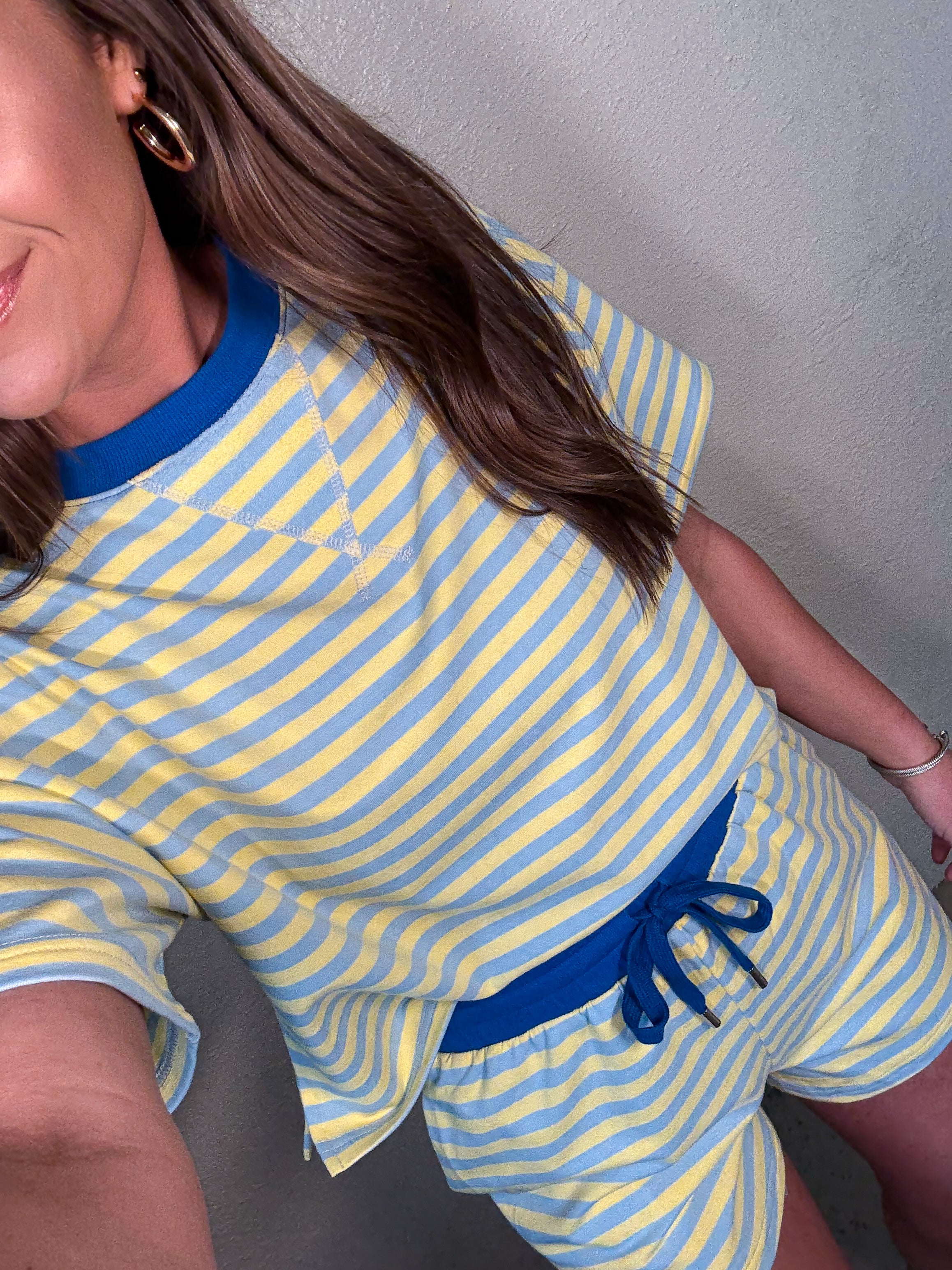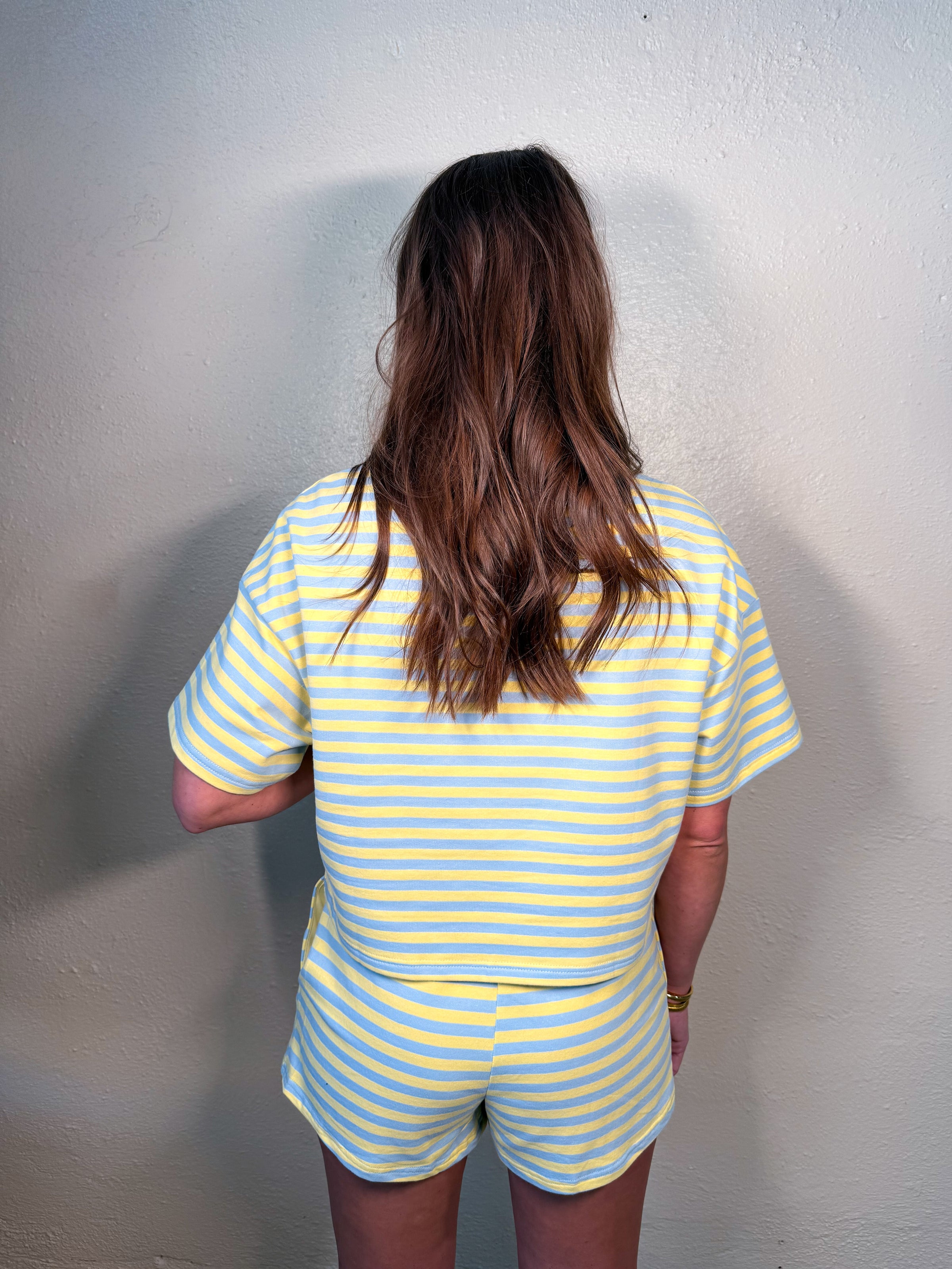 Terry striped short sleeve tee and shorts with contrasting band.