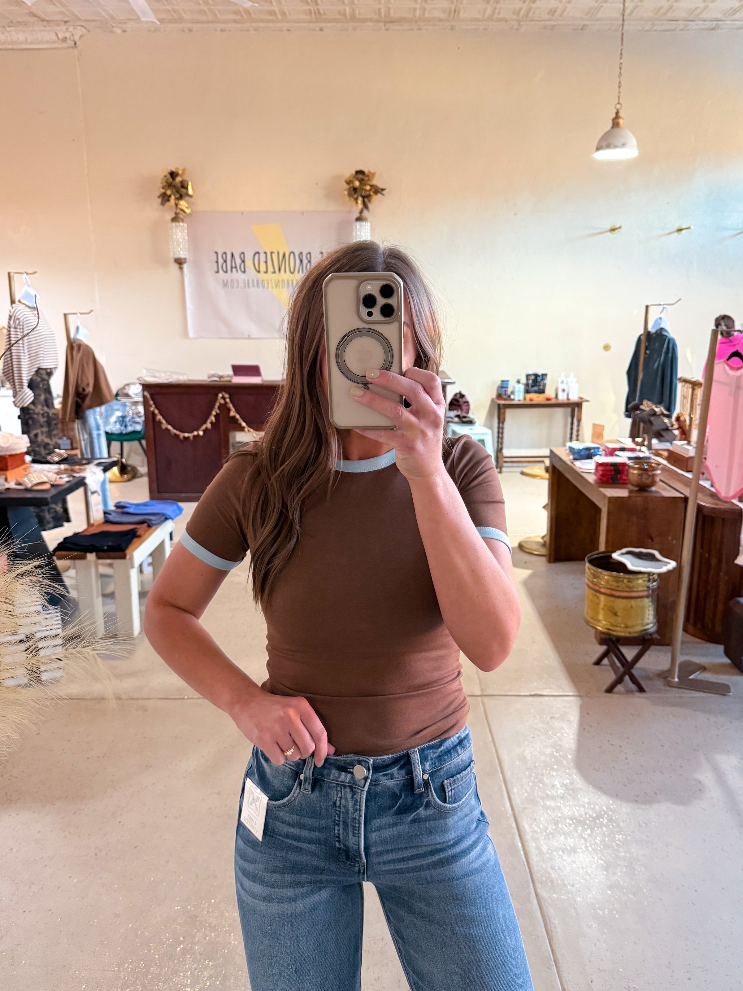 Brown tshirt with blue contrast trim.