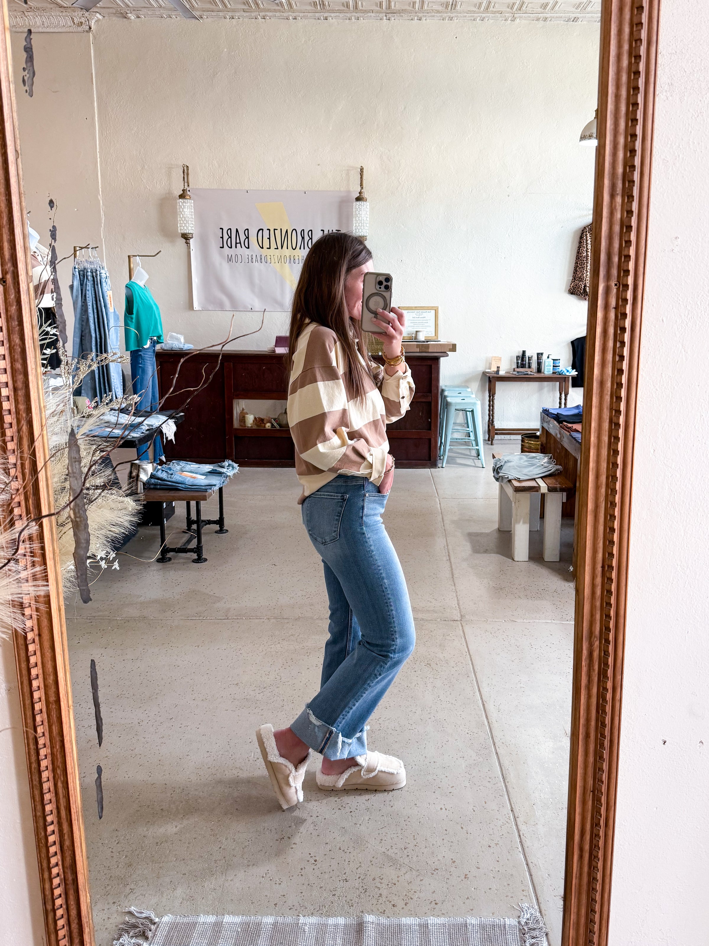 Tan suede slight platform mule with a strap across the top and faux fur lining.